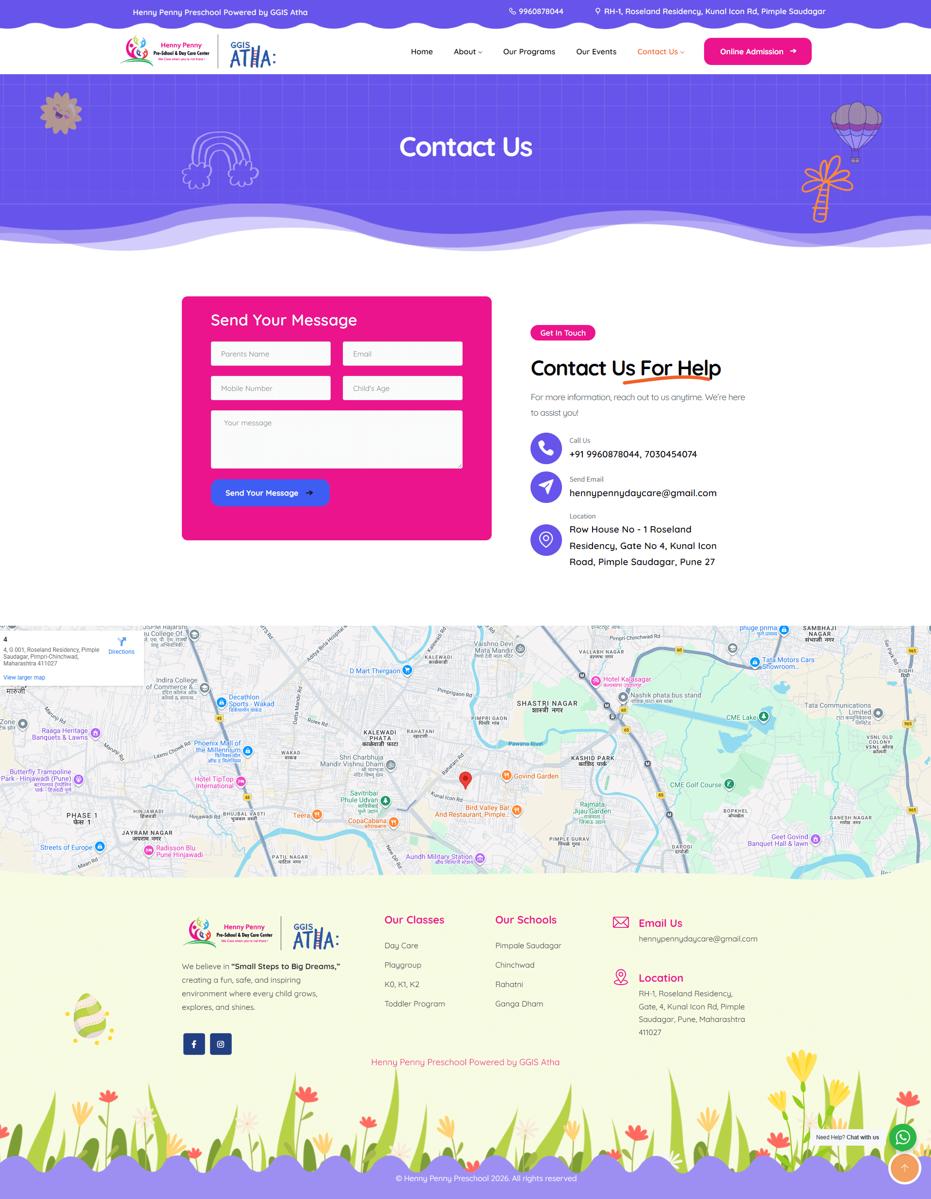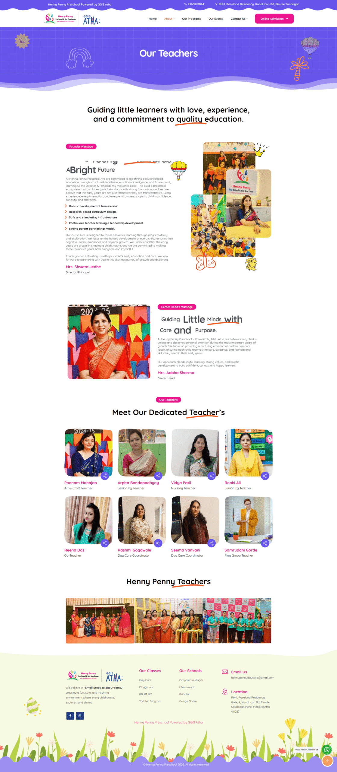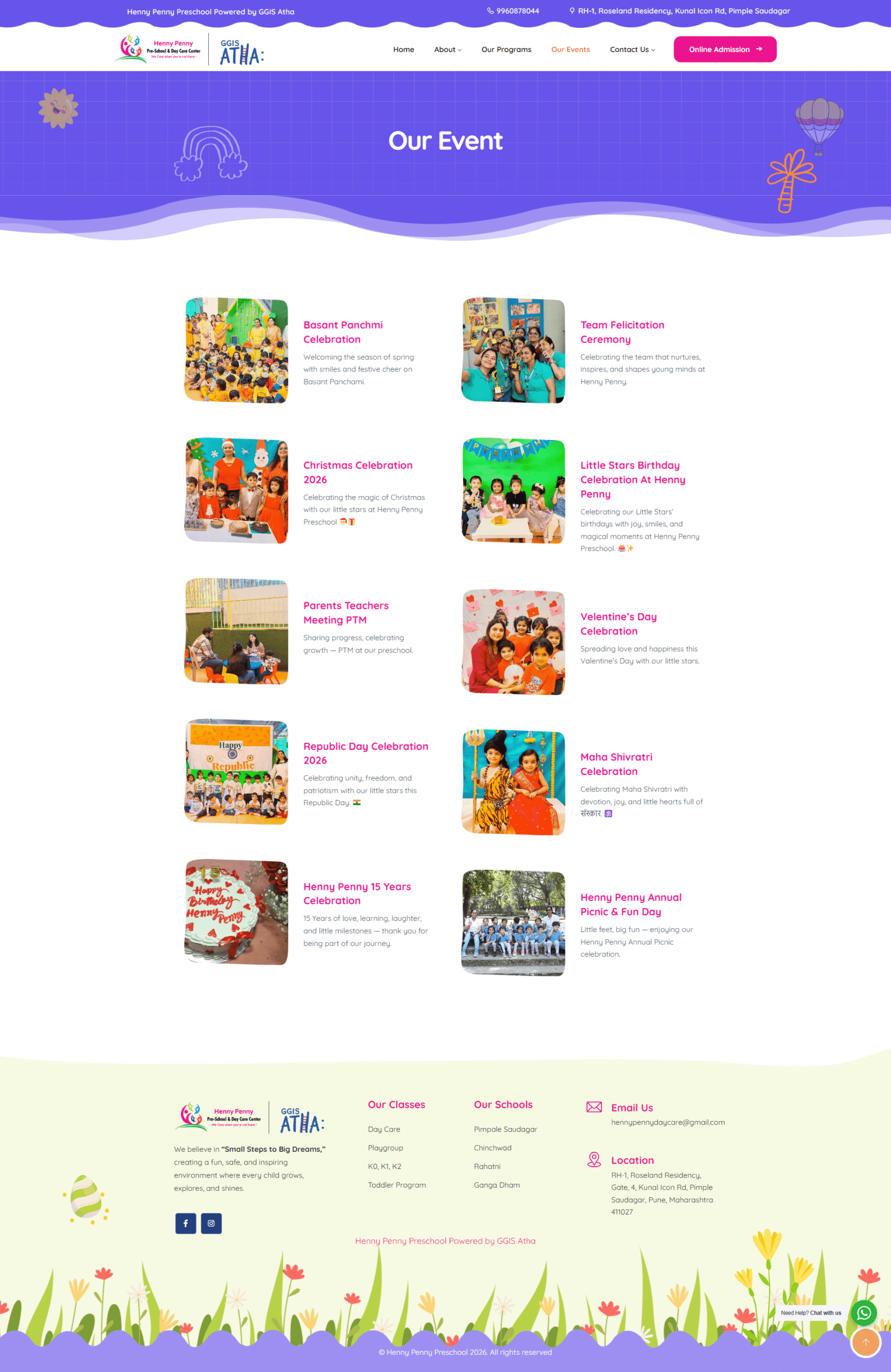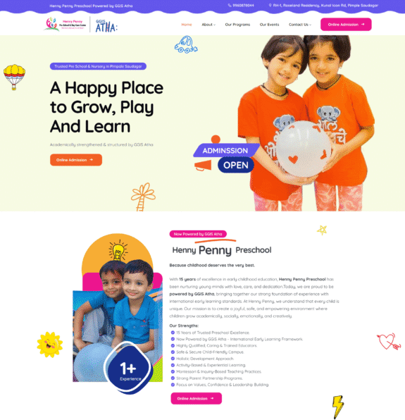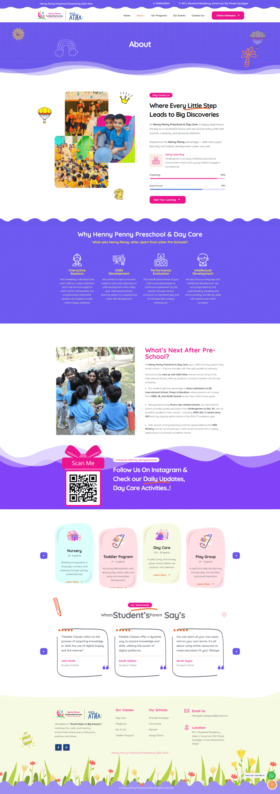 The final website for Henny Penny Preschool is modern, colorful, and easy to use. Parents can quickly find information about programs, activities, and admissions.