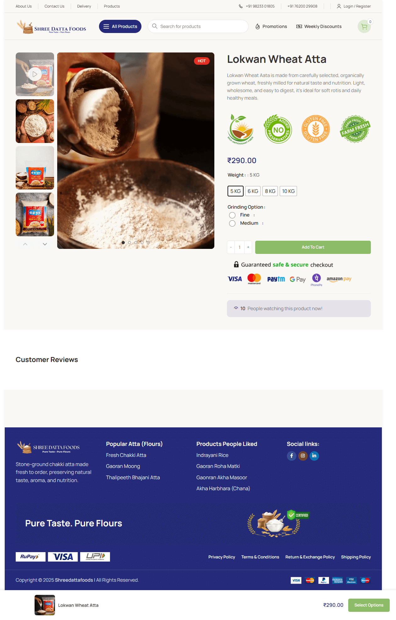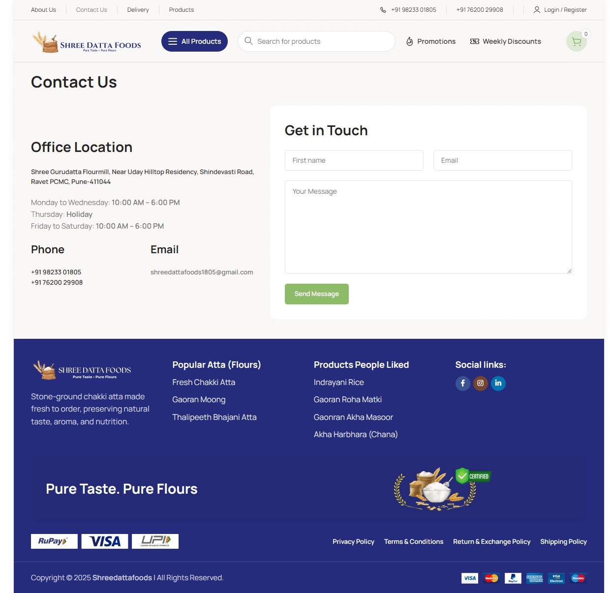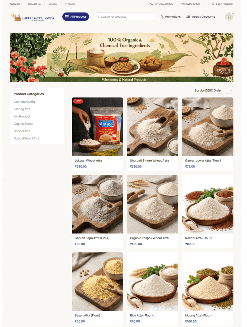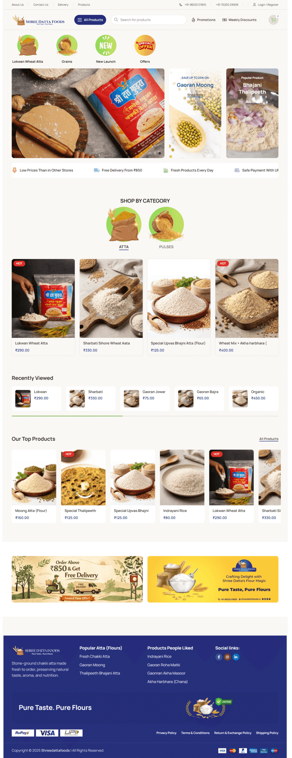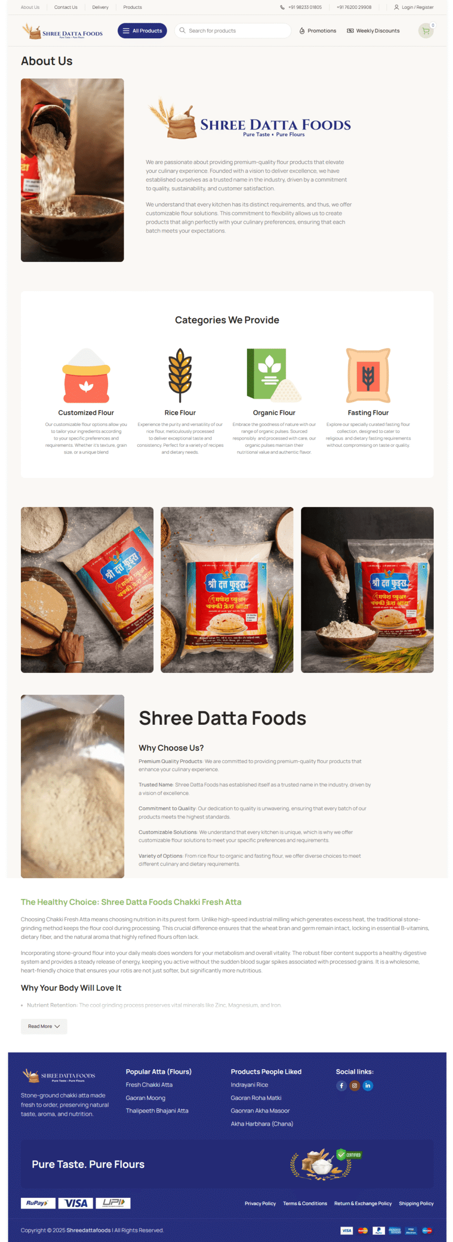The Shree Datta Foods e-commerce website was successfully launched with a clean design and smooth user experience. Customers can easily explore products, add items to their cart, and complete secure online purchases.